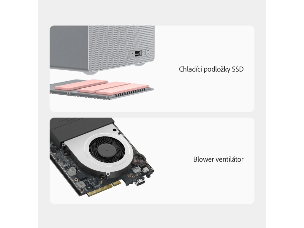 Až 72 TB dat lze uložit do až 5 disků. Dva 3.5" nebo 2.5" SATA disky a až tři M.2 2280 NVMe PCIe disky.