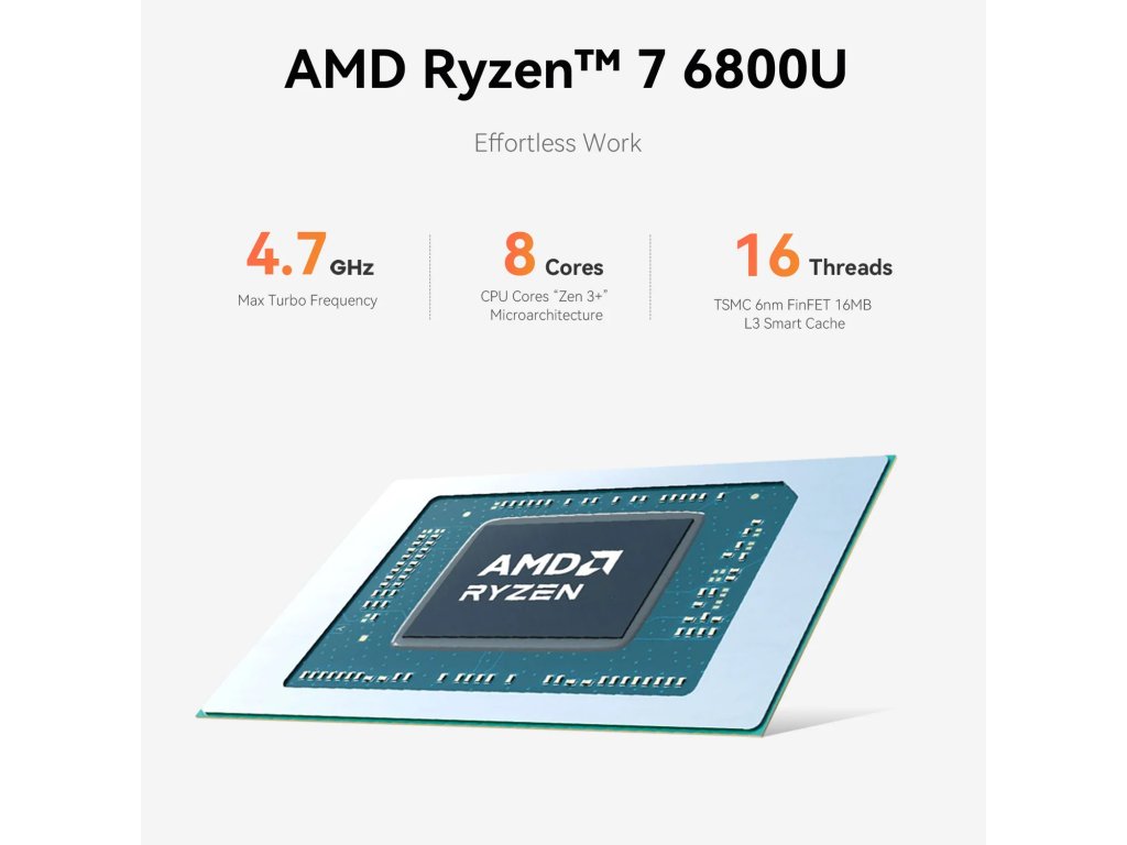 Procesor AMD Ryzen™ 7 6800U se vyznačuje vysokým výkonem spolu s grafickým osmijádrovým čipem AMD Radeon 680M s frekvencí 2.4GHz založený na architektuře RDNA2. Procesor postaven na mikroarchitektuře ZEN 3+ dosahuje běžného taktu 2.7 GHz s turbo výkonem až 4.7 GHz, obsahuje 8 jader a 16 vláken. Spotřeba energie v běžném režimu TDP je excelentních 28W.