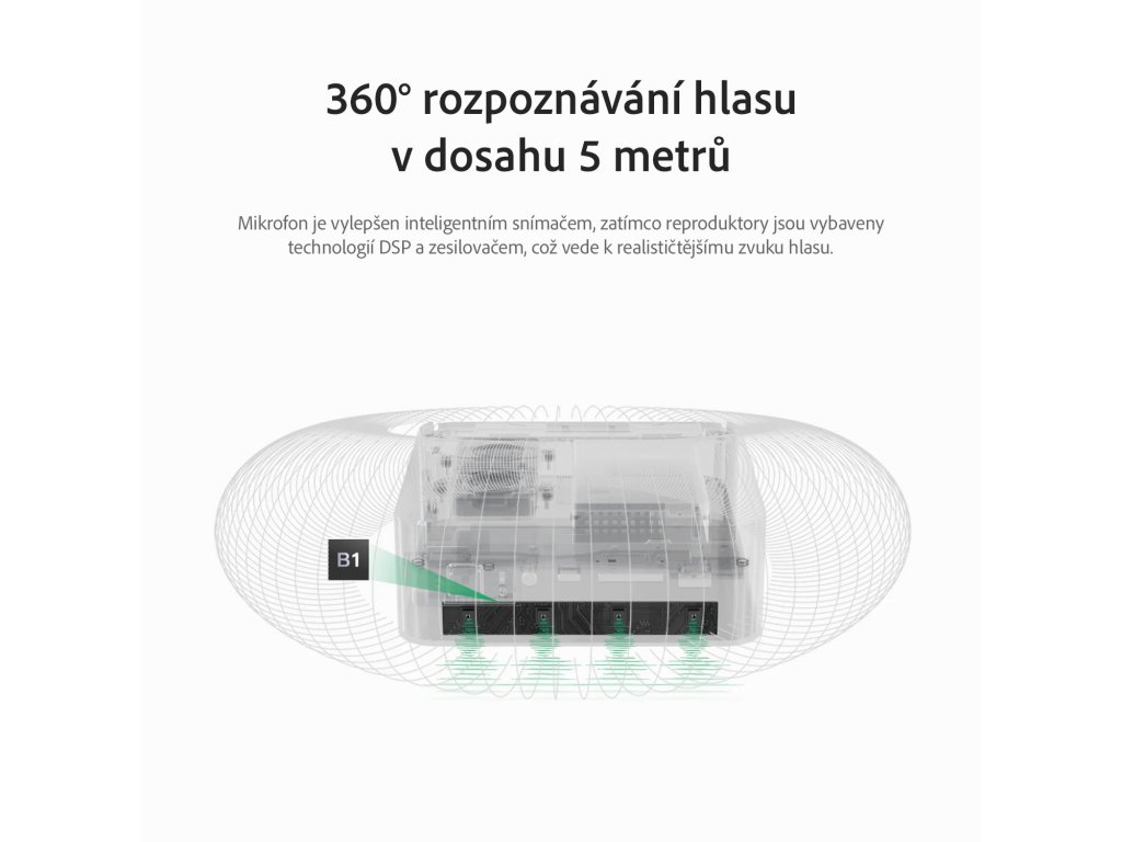Vestavěný mikrofon je napájen Al čipem, který podporuje inteligentní snímání zvuku, což mu umožňuje efektivně oddělit hlas od okolního hluku. Podporuje 360° rozpoznávání hlasu v okruhu 5 metrů, což umožňuje bezproblémové vedení videokonference bez nutnosti si přesedávat na bližší místa.