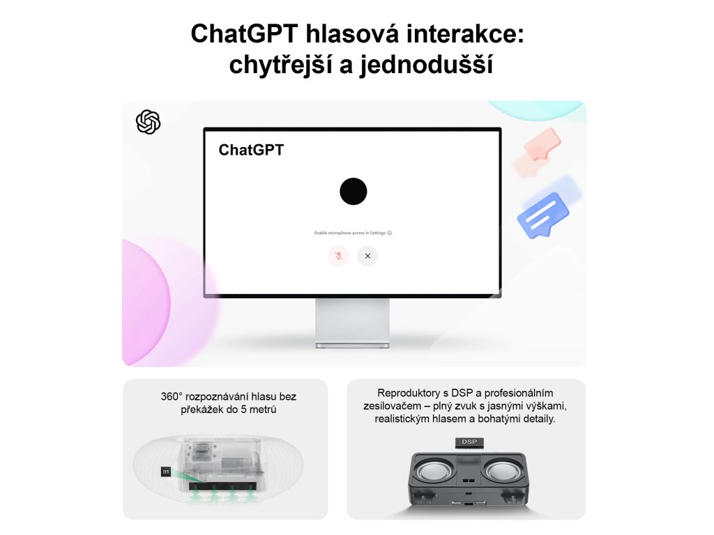 Vestavěný mikrofon je napájen Al čipem, který podporuje inteligentní snímání zvuku, což mu umožňuje efektivně oddělit hlas od okolního hluku. Podporuje 360° rozpoznávání hlasu v okruhu 5 metrů, což umožňuje bezproblémové vedení videokonference bez nutnosti si přesedávat na bližší místa.