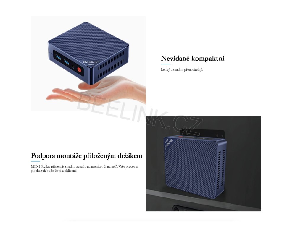 Praktický Mini PC nové generace Beelink MINI S12 4K Wi-Fi s 8GB nebo 16GB operační paměti, 256GB až 1.5TB SSD diskem a čtyřjádrovým procesorem Intel 12. generace N95. OS Windows 11 Pro CZ.