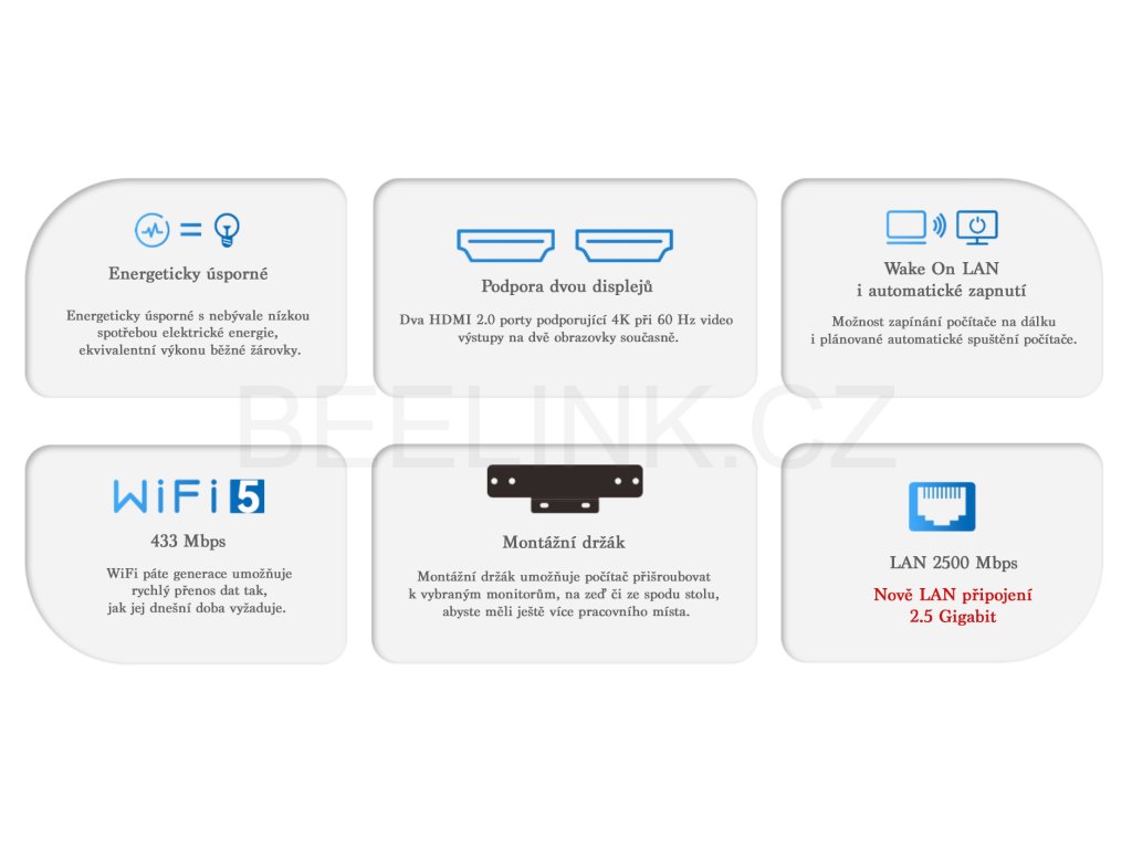 Praktický Mini PC nové generace Beelink MINI S12 4K Wi-Fi s 8GB nebo 16GB operační paměti, 256GB až 1.5TB SSD diskem a čtyřjádrovým procesorem Intel 12. generace N95. OS Windows 11 Pro CZ. Upgradovaný model 2026 - nově s 2.5Gbit síťovou kartou. Záruka 3 roky.