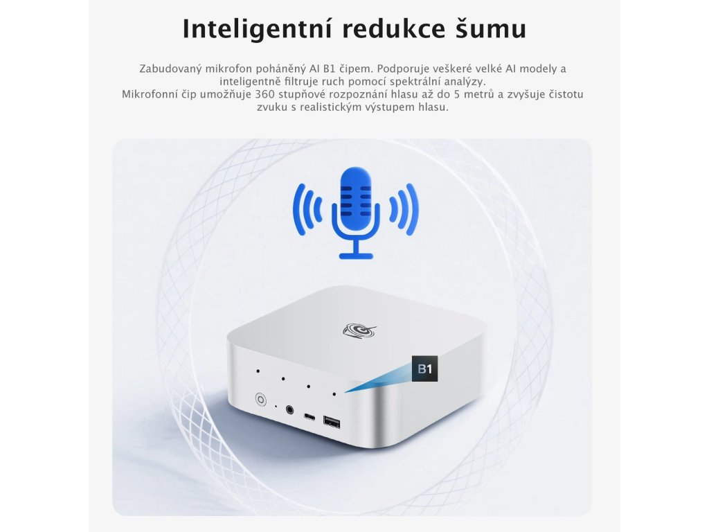 Vestavěný mikrofon je napájen Al čipem, který podporuje inteligentní snímání zvuku, což mu umožňuje efektivně oddělit hlas od okolního hluku. Podporuje 360° rozpoznávání hlasu v okruhu 5 metrů, což umožňuje bezproblémové vedení videokonference bez nutnosti si přesedávat na bližší místa.