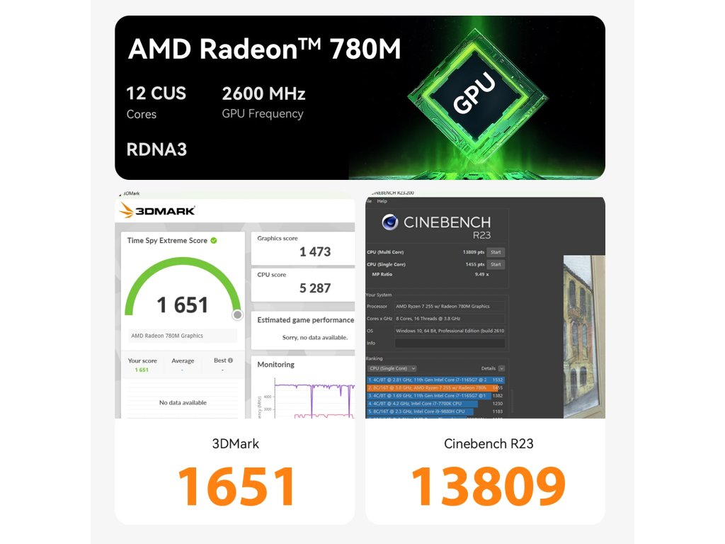 Procesor AMD Ryzen 7 H255 se vyznačuje vysokým výkonem spolu s grafickým šestnáctijádrovým čipem AMD Radeon 780M s frekvencí 2.6GHz založený na nové architektuře RDNA3. Procesor vyroben vyspělou 4 nm technologií Zen 4 dosahuje taktu až 5.1 GHz, obsahuje 8 jader a 16 vláken. Podporuje až tři monitory současně. Spotřeba energie (TDP) je pouze neskutečných 28W.