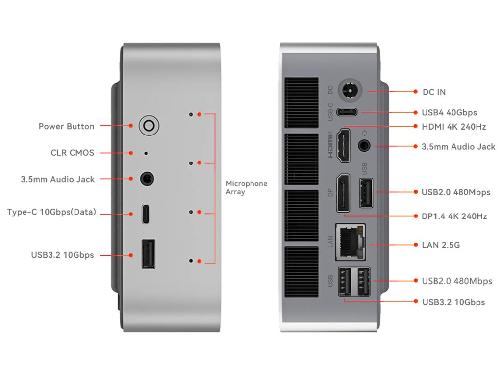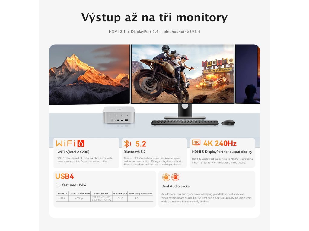 Podporuje standardy Wi-Fi 2.4+5.8G Wi-Fi 6E 802.11ax modulem Intel AX200 a nabízí pevné připojení pomocí RJ45 supervýkonného 2,5Gbit Ethernetu.